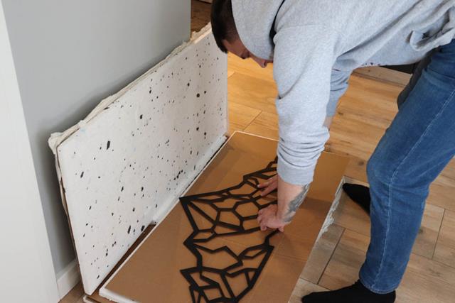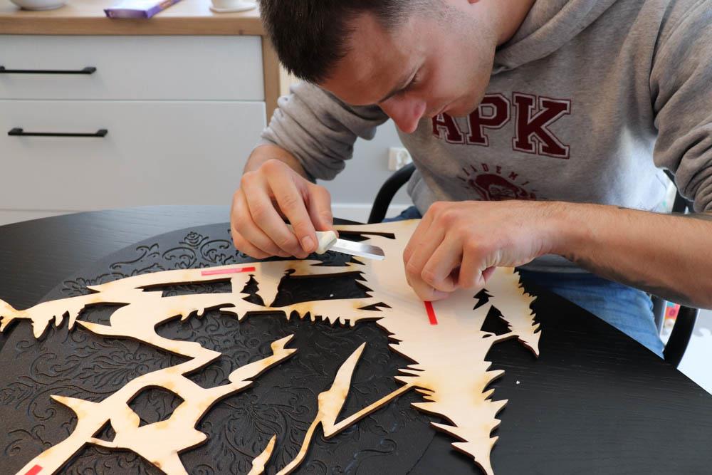 W przesyłce od Losokawood obrazy zabezpieczone są styropianem. Warto rozłożyć całość w jednym miejscu, najlepiej na dużym stole lub podłodze. Następnym etapem prac jest naklejenie na wszystkie części obrazów dwustronnej taśmy klejącej. Wystarczą małe kawałki w kilku miejscach, ponieważ mocowanie na taśmie dwustronnej 3M jest bardzo trwałe. Przymocowanie do ścian wszystkich obrazów zajęło nam ok. 30 minut.