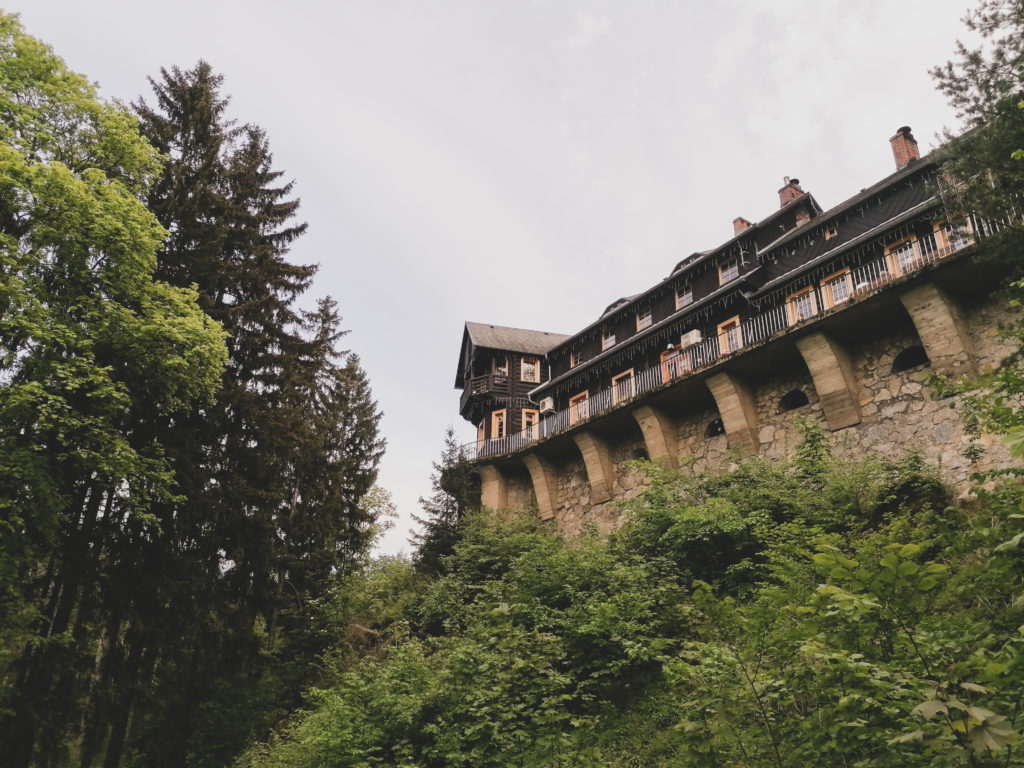 Nad brzegiem Jeziora Modre, nieopodal naszej trasy w Dolinie Bobru znajduje się majestatyczny budynek schroniska położony na wysokiej skale. Budynek postawiono w 1950 roku na miejscu starej przedwojennej gospody Turmsteinbaud. Gospoda jest bardzo podobna do przedwojennej poprzedniczki. Schronisko/Gospoda Perła Zachodu można uznać za kontynuację architektoniczną gospody, wybudowanej w 1927r. Po raz pierwszy kiedy dojechaliśmy tutaj wąską drogą wzdłuż rzeki Bóbr, nie mogłam uwierzyć dlaczego właśnie tutaj ktoś postanowił wybudować schronisko. Jego malownicze usytuowanie i strome urwisko, które jest jednocześnie linią brzegową jeziora, robią niesamowite wrażenie na odwiedzających. Można tu dojechać na rowerze z centrum Jeleniej Góry (ok 8 km) lub samochodem na parking znajdujący się obok gospody.
